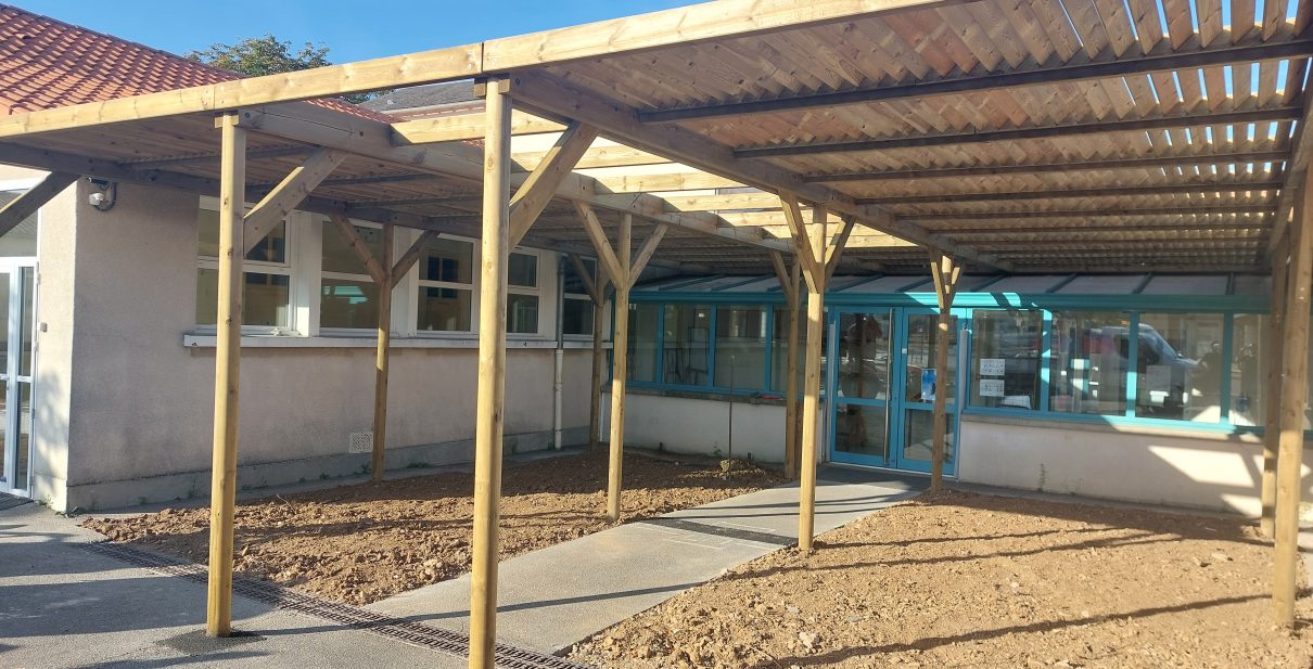 Nous sommes fiers de vous présenter l’une de nos dernières réalisations : la conception et la fabrication d’une pergola en bois sur-mesure pour accompagner la déminéralisation d’une cour d’école.